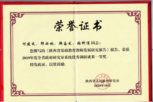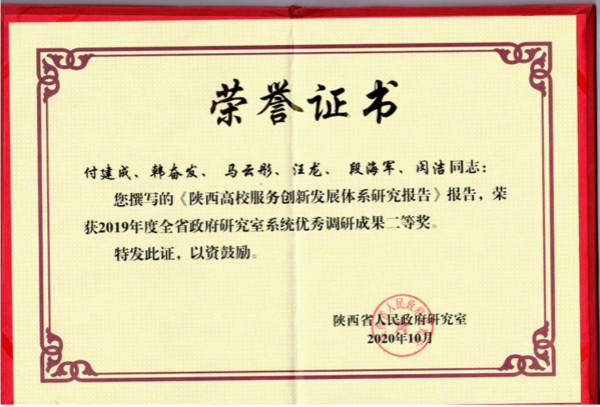 会议宣读了“陕西省人民政府研究室关于表彰2019年度全省政府研究室系统优秀调研成果的通知”(陕政研发【2020】4号)文件。由陕西省人民政府研究室和我校共建的新型大学智库——陕西区域发展研究院,报送的研究成果荣获三项优秀调研成果奖:教育类研究成果方面,由我校付建成教授、邵必林教授等研究团队,根据陕西省教育厅《关于做好2019年调查研究工作的通知》“陕教政办〔2019〕1 号”文件的精神要求,组织调研撰写申报的《陕西省基础教育教师发展研究报告》,荣获一等奖;由我校付建成教授等研究团队,申报的《陕西高校服务创新发展体系研究报告》,荣获二等奖。社会服务类研究成果方面,由我校韩奋发研究员等研究团队,组织调研撰写申报的《乡村产业振兴衔接扶贫推动富民的研究报告》,荣获一等奖。