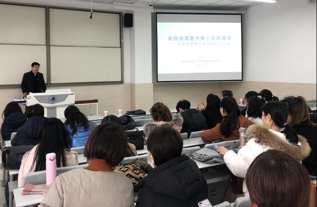 12月9日下午两点半,西安外国语大学博士生导师孙二军教授应邀在四号教学楼阶5教室为外国语学院全体教师及大学生创新创业项目负责人做了一场题为“高级别课题申报漫谈——以英语教师专业发展为例”的学术报告。